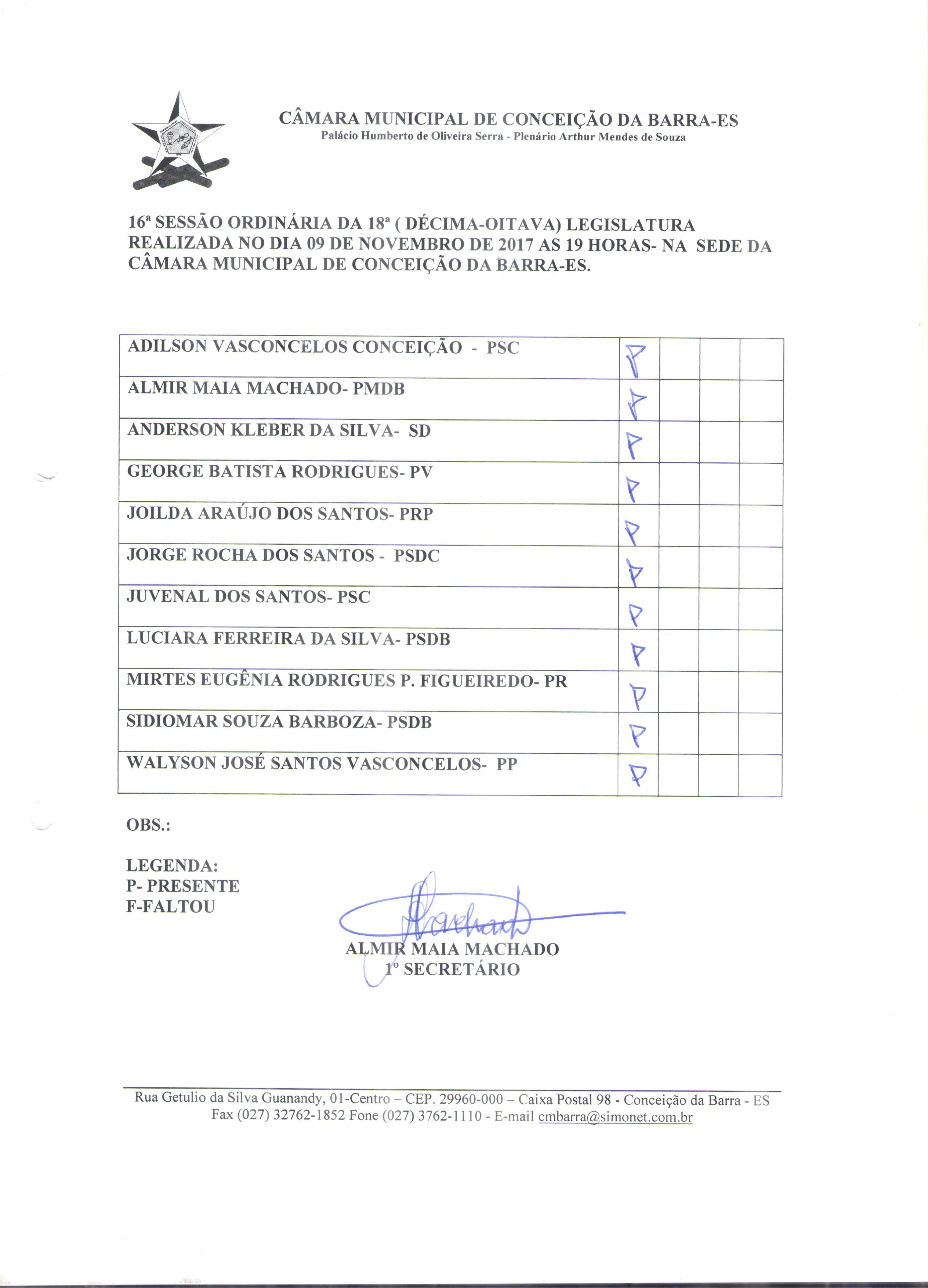 16ª (DÉCIMA SEXTA) SESSÃO ORDINÁRIA DIA 09 DE NOVEMBRO DE 2017-SEDE